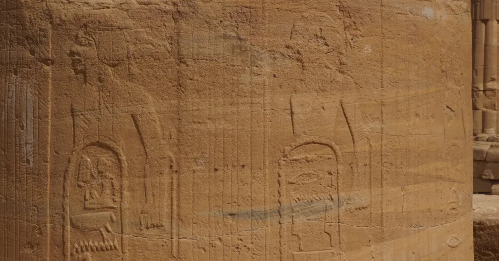 Soleb is situated about 60 kilometres north of the Third Cataract, on the west bank of the Nile. Its main monument is a large temple erected under Pharaoh Amenhotep III (c. 1390–1350 BC). It was dedicated to Amun-Ra of Karnak and a local manifestation of the deified Amenhotep III as Lord of Nubia. Equalling the most important temples in Egypt, both in size and appearance, it has a classical New Kingdom structure with a processional route, massive pylons, two peristyle courts, a pillared hall and (largely lost) sanctuaries. It is also the southernmost temple built by Amenhotep III, forming an assemblage with its twin structure at Sedeinga, which was dedicated to Queen Tiye as a manifestation of the Eye of Ra.